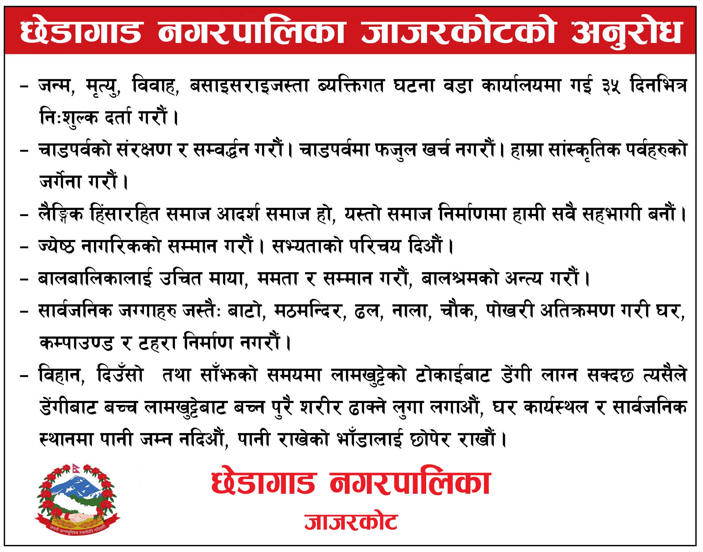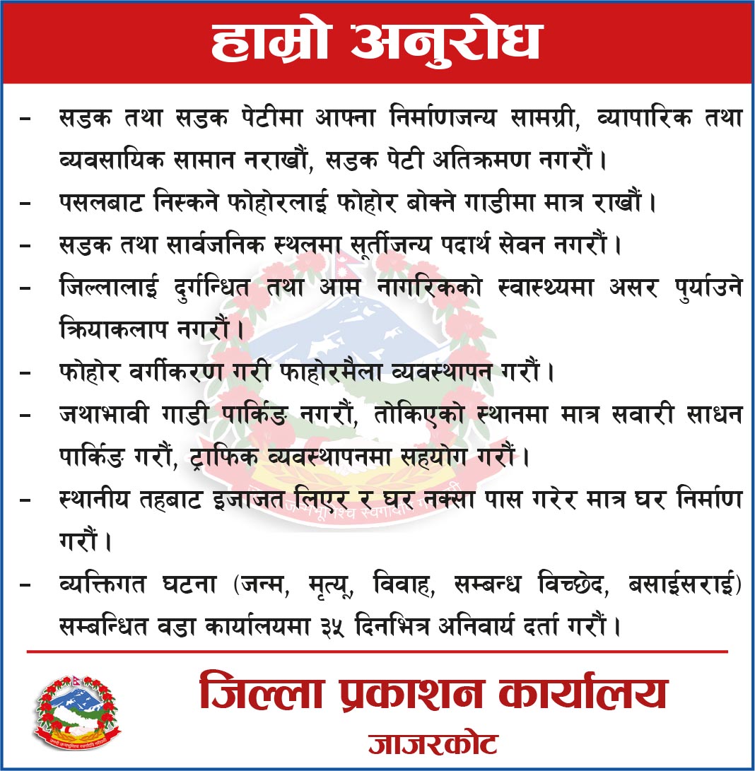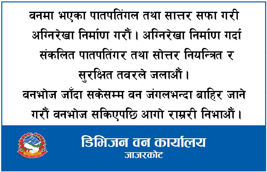 जनसन्देश सम्बाददाता जाजरकोट, चैत ५ गते । वन डढेलो व्यवस्थापन सप्ताह २०८२ अन्तर्गत मा वन डढेलो नियन्त्रणसम्बन्धी स्थलगत कृत्रिम अभ्यास कार्यक्रम सम्पन्न गरिएको छ। डिभिजन वन कार्यालय जाजरकोटको आयोजनामा भेरी नगरपालिका १ र ३ क्षेत्रमा पर्ने स्यालापाखा–कालेगाउँ सामुदायिक वनक्षेत्रमा उक्त