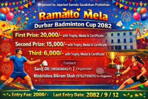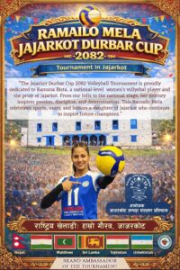 जाजरकोट, पुस १ गते । जाजरकोट खलंगामा आयोजना हुने “रमाइलो मेलामा – जाजरकोट दरबार कप २०८२” भलिबल प्रतियोगिताकोआयोजना हुने भएको छ । परम्परागत रुपमा लाग्दै आएको मेलामा खेलकुदमार्फत स्थानीय युवालाई प्रोत्साहन गर्ने उद्देश्यले आयोजना हुन लागेको उक्त प्रतियोगितामा आकर्षक नगद पुरस्कारको व्यवस्था गरिएको आयोजकले जनाएको छ ।
