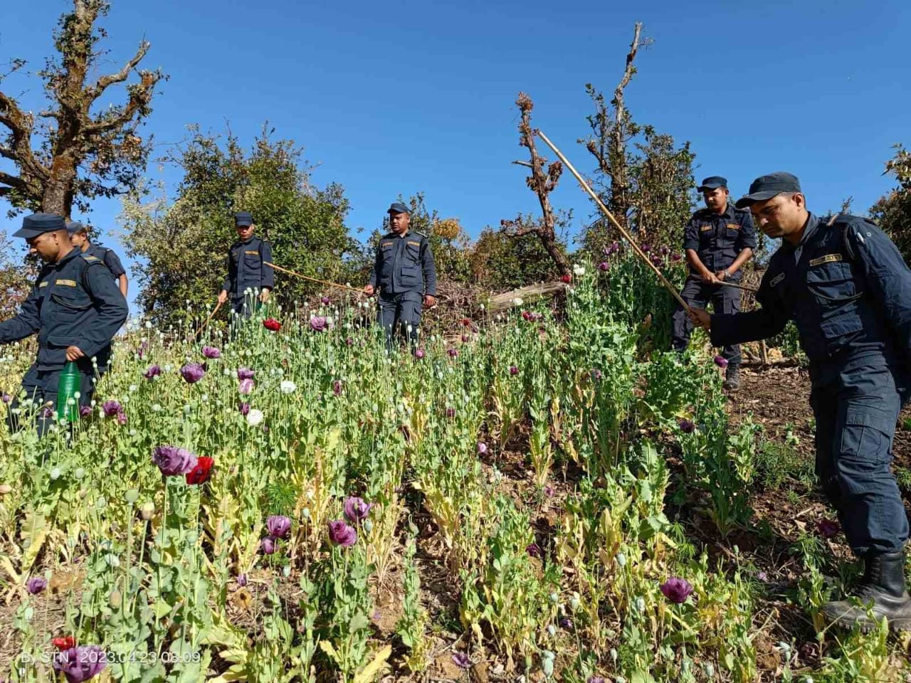 जाजरकोट, वैशाख १२ गते । जाजरकोट प्रहरीले जिल्लाका दुर्गम भेगमा लगाइएका अवैध रुपमा खेति गरिएको अफीम खेती नष्ट गर्ने अभियान थालेको छ । जिल्लाकोे नलगाड , भेरी , जुनिचाँदे र बारेकोट पालिकाका विभिन्न दुर्गम वडाका लेकाली वस्तिहरुमा अवैध रुपमा र आफै प्राकृतिक रुपमा उम्रीएर रहेको अफिम खेती पाइने गरेको छ ।