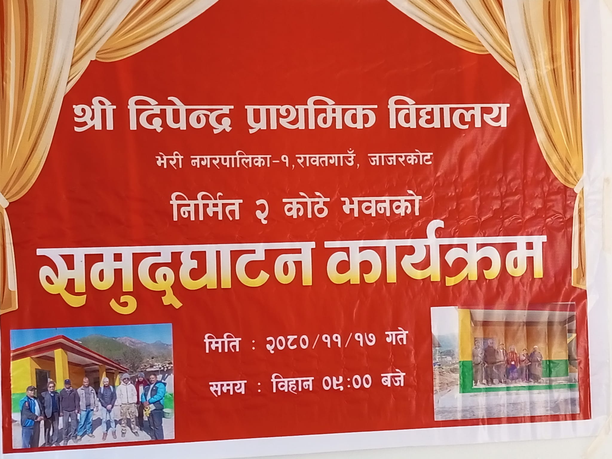 जाजरकोट, फागुन १७ गते । दिपेन्द्र प्राथमिक विद्यालय भेरी नगरपालिका १ रावतगाउँको २ कोठे भवनको समुद्घाटन भएको छ । प्रधान मन्त्री स्वरोजगार कार्यक्रम र भेरी नगरपालिकाको आर्थिक सहयोगमा निर्मित २ कोठे भवनको आज एक समारोहका विच उद्घाटन गरिएको हो ।