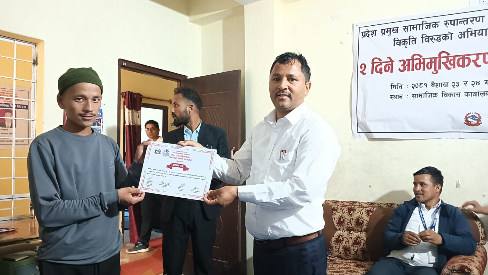 सामाजिक विकास कार्यालय जाजरकोटका प्रमुख यज्ञश्वर खत्रीले प्रदेश प्रमुख सामाजिक रुपाण्तरन कार्यक्रम अन्तरगत भेरी नगरपालिकका १३ वटै वडाका अभियान्ताहरु लाई तालिम प्रदान गराई अभियान्ताको रुपमा परिचालन गरिएको बताउनु भयो । अव वडामा हुने विभिन्न सामाजिक असभयानमा ति अभियान्ताहरुको सहभागिता रहने कार्यालय प्रमुख खत्रीले जानकारी दिनु भयो ।